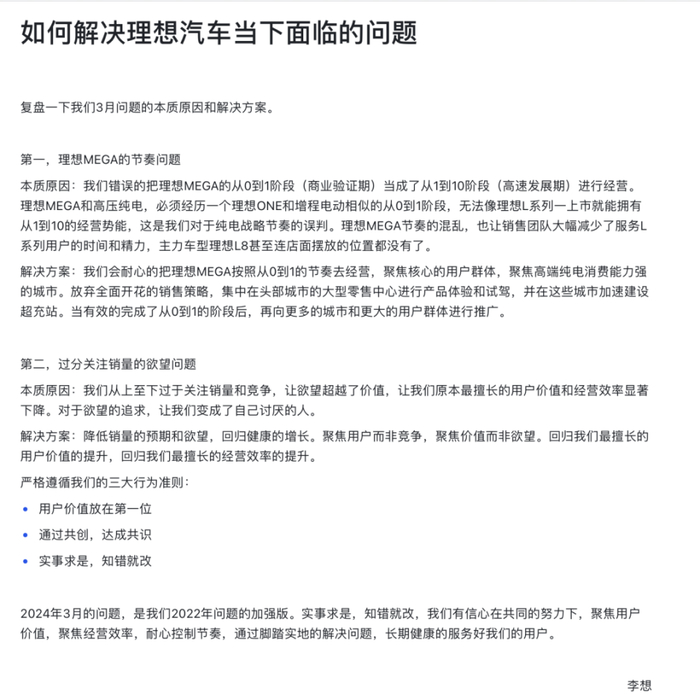 直到3月21日,李想向内部发了一封全员信。在这封全员信中,他复盘了理想在3月遇到的问题——曾经放话要“做50万以上车型销冠”的MEGA失利。进行自我批评之后,李想指出了理想遭遇此番危机的几大根本原因,并拿出了具体的解决方案。