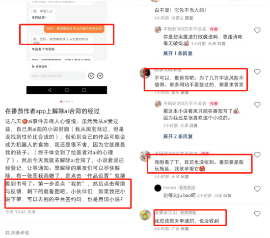据悉,对于已经签署补充协议或签约条款中包含AI条款的作家,如果对条款有疑虑,可通过后台反馈,番茄小说方面将为反馈人安排尽快解除AI条款约定。另有番茄小说客服人员对新浪科技表示,“目前合同中已删除AI相关条款,新签约的作品将不再包含AI相关条款。”对于已经签约的人员,该客服表示,“后续会按照申请先后顺序进行处理,请关注站内信通知。”