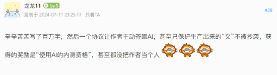 对于这样的一份协议,大部分作家表达了强烈抵触。在某论坛上,大量的网文读者和作家涌入评论区,一致认为这是典型的“白嫖”,直言辛辛苦苦写了百万字,“现在让我们把成果去‘投喂’AI?”。