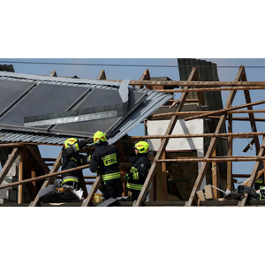 △波兰卢布林地区,消防员聚集在一座被无人机损毁的房屋屋顶上进行检查。